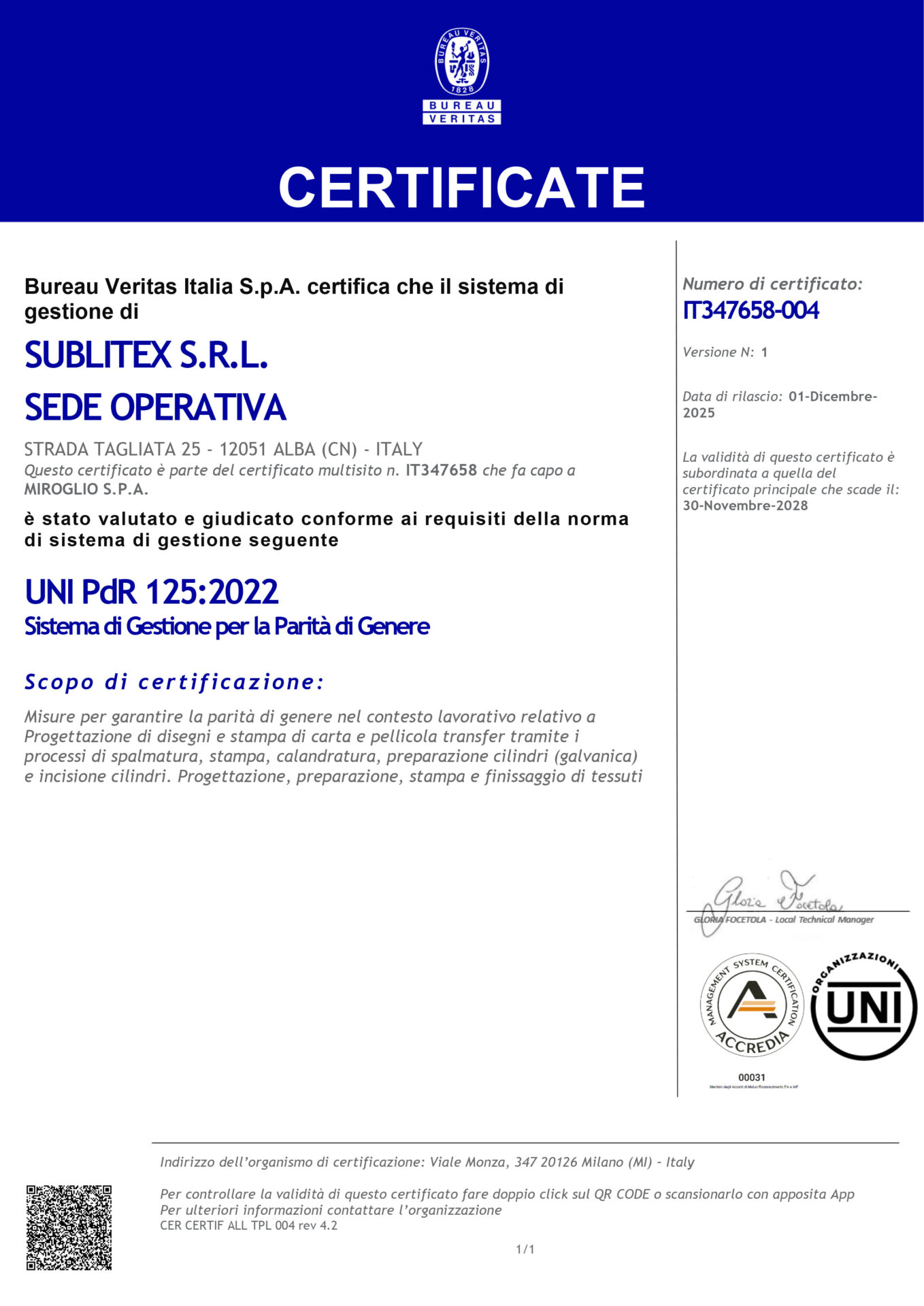 Questo impegno è attestato dalle numerose certificazioni ottenute, che riflettono una filosofia aziendale fondata su qualità, innovazione tecnologica e sostenibilità dei processi produttivi. Un elemento distintivo in un mercato globale sempre più competitivo, che conferma l’attenzione di Sublitex verso le tematiche ambientali e le nuove esigenze emerse nel panorama industriale internazionale dell’ultimo decennio.